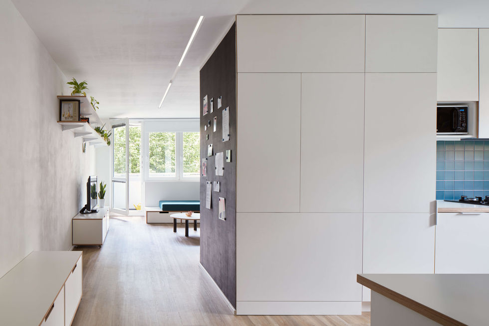 Hlavním úkolem rekonstrukce bylo přidat pokoj navíc, dopřát tak oběma dětem luxus vlastního pokojíčku. Prostor pro společné trávení času prostupuje celým bytem a vytváří zálivy s různými funkcemi. Rodina miluje sport, nemohli jsme na něj proto v návrhu zapomenout.